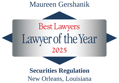 Maureen is a past chairperson and council member of the Louisiana State Bar Association’s Section on Corporate and Business Law. She has been a speaker on securities and corporation law at legal seminars and graduate schools, and she serves as co-instructor of the Corporate Governance mini-course at Tulane University Law School. She is a board member of the National Council of Jewish Women – Greater New Orleans and also serves on the Jewish Endowment Foundation of Louisiana Board of Directors. She is a former member of the Board of Trustees at Touro Synagogue (New Orleans). Maureen is co-leader of the Fishman Haygood Women’s Group, and she serves on the Advisory Committee for the Greater New Orleans Foundation’s Impact 100 women’s giving initiative.